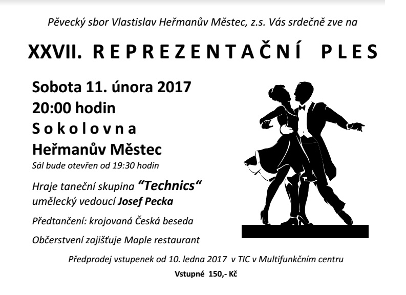 Letošní již XXVII. reprezentační ples se uskuteční v sobotu 11. února 2017 od 20:00 hodin v sokolovně. Čeká Vás bohatý program, po roční pauze opět oblíbené předtančení České besedy a další překvapení. K tanci bude po celý večer hrát taneční skupina Technics p. Pecky z Turkovic. Vstupenky jsou v předprodeji na TIC v Heřmanově Městci od 10. ledna 2017.